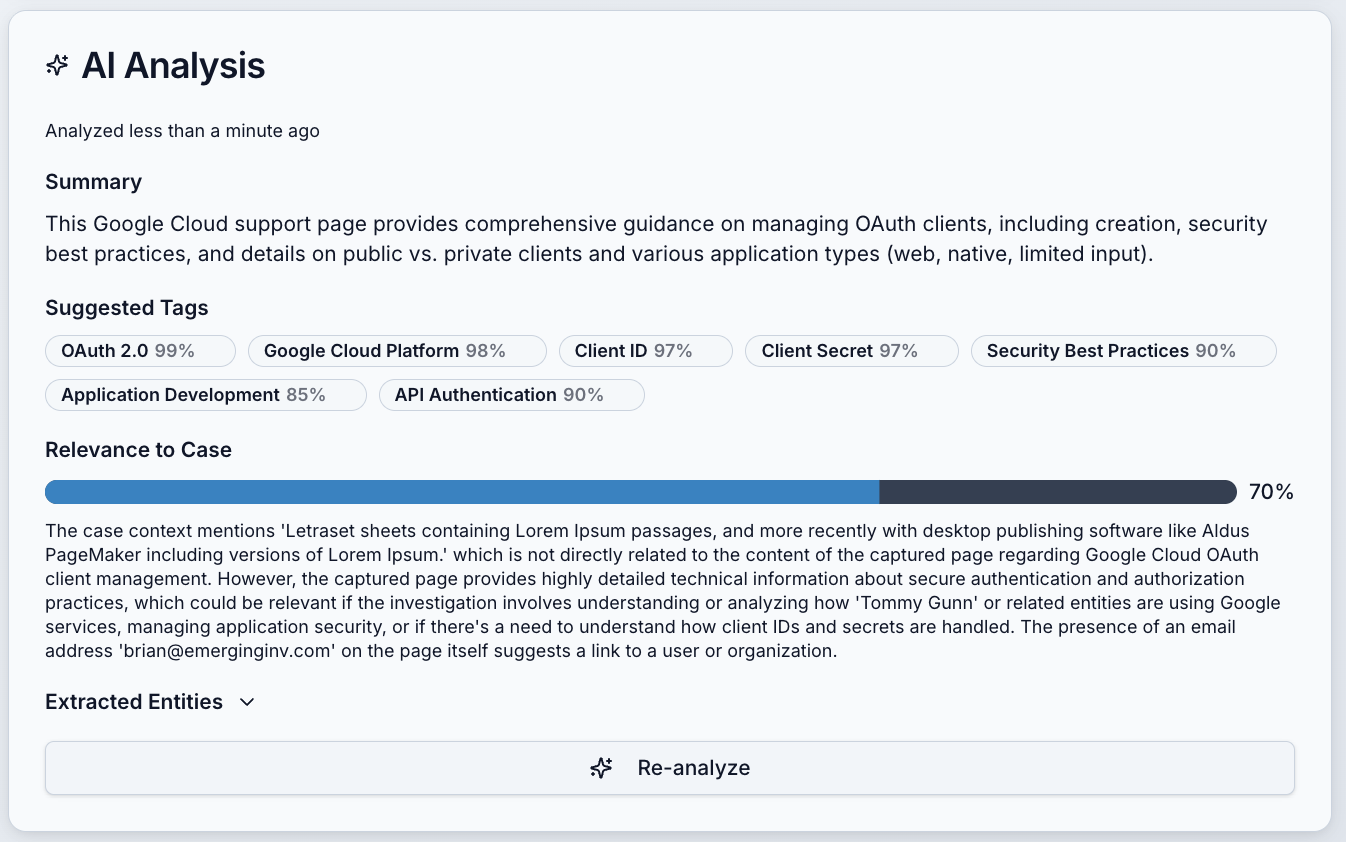 Instead of sifting through screenshots, webpages, or records, Veriscope surfaces patterns, highlights key elements, and provides concise summaries that accelerate review while preserving the integrity of the original evidence.